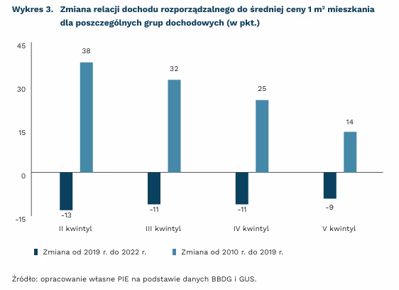 Obserwowana od 2010 r. do 2019 r. korzystna relacja między wzrostem cen mieszkań a wzrostem wynagrodzeń w największym stopniu poprawiła sytuację osób mniej zamożnych i średnio zamożnych. Wśród osób należących do II kwintyla dochodowego, a więc pomiędzy 20 proc. a 40 proc. najlepiej zarabiających, zdolność do sfinansowania zakupu 1 m2 mieszkania z dochodu rozporządzalnego wzrosła w tym czasie o 38 pkt.[3]. Wśród osób lepiej zarabiających wzrost ten był słabszy i wahał się od 32 pkt. dla osób z III kwintyla dochodowego, do 14 pkt. dla osób z V kwintyla zarobkowego. Należy jednak zaznaczyć, że wzrost dochodów osób należących do V kwintyla, a więc najlepiej zarabiających, jest prawdopodobnie niedoszacowany[4]. Oznacza to, że z dużym prawdopodobieństwem zmiana relacji dla V kwintyla dochodowego jest niedoszacowana.
