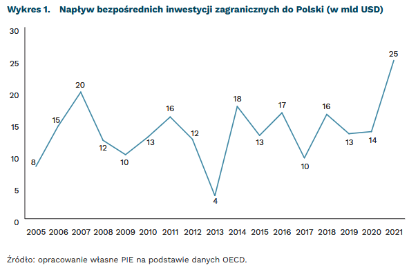 Polska była 14. na świecie i 3. w UE za Niemcami i Szwecją pod względem wartości napływu bezpośrednich inwestycji zagranicznych (BIZ) w 2021 r. Napływ inwestycji był rekordowo wysoki i wyniósł 24,8 mld USD. Napływ BIZ do Polski wzrósł w 2021 r. o 82 proc., a w porównaniu z 2019 r., czyli przed pandemią, o 86 proc. Był to 5. wynik na świecie po RPA, Łotwie, Szwecji i Austrii. Wcześniej najwyższy napływ inwestycji Polska odnotowała w 2007 r. w wysokości 19,9 mld USD.