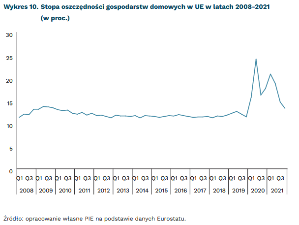 Przed okresem pandemii oszczędności gospodarstw domowych w UE utrzymywały się na stabilnym poziomie. W latach 2018-2020 średnia kwartalna stopa oszczędności wynosiła około 12 proc. rozporządzalnego dochodu. W okresie tym zanotowano jedynie niewielkie wahania tego wskaźnika. W 2020 r. oszczędności wystrzeliły do ok. 25 proc. i chociaż zmniejszyły się w III kwartale 2020 r., w którym zaczęto łagodzić obostrzenia, to w I kwartale 2021 r. znów wzrosły do blisko 21 proc. Dane z IV kwartału 2021 r. pokazują jednak, że wraz z informacjami o wygasaniu pandemii średni poziom oszczędności zbliżył się do wartości sprzed pandemii (13,3 proc.), potwierdzając wcześniejsze hipotezy o wymuszonym charakterze pandemicznych oszczędności.