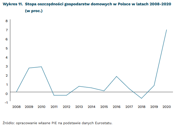 W Polsce 2020 r. również był rekordowy pod względem wzrostu wskaźnika oszczędności gospodarstw domowych, chociaż jego wartości w analogicznym okresie były zdecydowanie niższe niż średnia unijna. Wartość wskaźnika w 2020 r. wyniosła 6,85 proc. w porównaniu z 0,7 proc. w 2019 r.