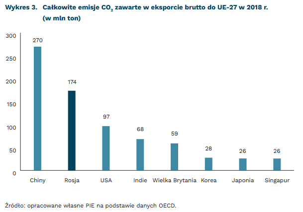 Za najwięcej emisji odpowiadały: import metali (41,3 mln ton CO2), koksu i produktów rafinacji ropy naftowej (32 mln ton CO2), usługi związane z transportem i magazynowaniem (21 mln ton CO2), kupno oraz naprawa pojazdów samochodowych (12,2 mln ton CO2) oraz produkty chemiczne i chemikalia (10,5 mln ton CO2)3. Według planów Komisji Europejskiej, część importowanych produktów (stal i żelazo, aluminium, nawozy, cement oraz energia elektryczna) miała zostać objęta systemem opłat od importu emisji (CBAM)4. W tych sektorach, zidentyfikowanych jako wysokoemisyjne, największym eksporterem do UE-27 jest Rosja, która w latach 2015-2019 średnio odpowiadała za 16,7 proc. całości ich importu (pow. 10 mld USD rocznie)5.