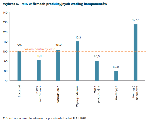 W kwietniu odnotowaliśmy więcej firm produkcyjnych z zapasem gotówki i nieco więcej firm inwestujących. Aż 62 proc. firm produkcyjnych wskazywało, że posiadają środki finansowe, które pozwolą na funkcjonowanie powyżej trzech miesięcy, w poprzednim miesiącu ten odsetek był mniejszy o 9 pkt. procentowych. Jednocześnie rośnie odsetek firm produkcyjnych inwestujących w aktywa materialne lub niematerialne. W marcowym odczycie mieliśmy 38 proc. takich firm, a w kwietniowym 43 proc. Warto jednak podkreślić, że od początku pomiarów ogólny wskaźnik MIK dotyczący inwestycji wciąż nie przekroczył poziomu neutralnego.