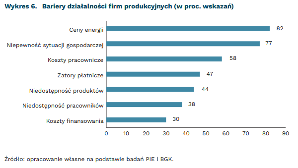 Rośnie udział firm produkcyjnych, dla których niedostępność produktów, półproduktów i materiałów jest znaczącą barierą działalności. W marcu na braki w materiałach wskazywało 33 proc. firm, a w kwietniu aż 44 proc. Rośnie też udział firm produkcyjnych wskazujących na zatory płatnicze, podczas gdy jeszcze w marcu było to 38 proc., a w kwietniu już 47 proc. przedsiębiorstw. Do tego dochodzi wciąż wysoki (82 proc.) odsetek firm produkcyjnych skarżących się na ceny energii i duży udział firm (77 proc.), dla których niepewność sytuacji gospodarczej jest doskwierającą barierą działalności. Ocenę barier funkcjonowania firm produkcyjnych można łączyć z sytuacją związaną z działaniami wojennymi. Braki w dostępności materiałów wynikają często z zerwanych łańcuchów dostaw, w szczególności gdy dostawcy znajdowali się za naszą wschodnią granicą.