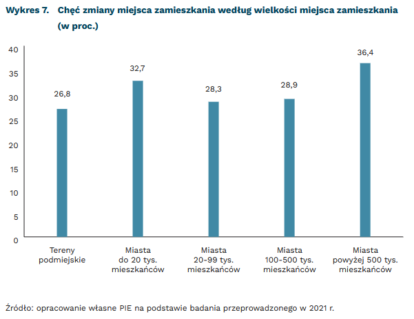 Chęć zmiany miejsca zamieszkania najczęściej deklarują mieszkańcy największych miast, a najrzadziej mieszkańcy stref podmiejskich. Taką chęć deklaruje ponad 36 proc. mieszkańców miast z ludnością powyżej 500 tys. mieszkańców. Nieco rzadziej mieszkańcy najmniejszych (niemal 33 proc.) i średnich miast (28,3-28,9 proc.). Najmniej chęci do zmiany miejsca zamieszkania deklarują osoby mieszkające w strefach podmiejskich miast wojewódzkich (niemal 27 proc. z nich). Wynik taki jest zbieżny z obserwowanym w ostatnich latach saldem rejestrowanych przepływów ludności między stolicami województw a obszarami podmiejskimi miast wojewódzkich. Przykładowo, w 2019 r. 56 tys. osób wyprowadziło się ze stolicy województwa do obszaru podmiejskiego, zaś 28,5 tys. dokonało migracji odwrotnej11.