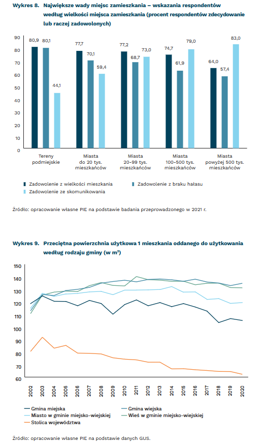 Niezadowolenie z wielkości mieszkania oraz odczuwany nadmiar hałasu to dwie najczęściej wskazywane wady mieszkania w największych miastach. Im większa miejscowość, tym większy poziom niezadowolenia respondentów z tych dwóch aspektów życia. Najwyższy poziom zadowolenia z wielkości mieszkania oraz poziomu hałasu deklarują mieszkańcy stref podmiejskich, a najniższy mieszkańcy miast z ludnością przekraczającą 500 tys. mieszkańców. Częściowo te dwa negatywne aspekty życia w największych miastach rekompensuje stosunkowo najlepsze skomunikowanie, na które z kolei najczęściej narzekają mieszkańcy stref podmiejskich.