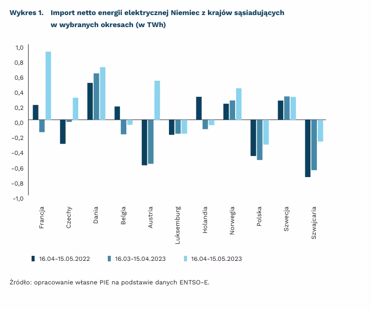 Niemiecka gospodarka, po wyłączeniu w połowie kwietnia ostatnich działających elektrowni jądrowych, w okresie 16.04-15.05.2023 r. z eksportera stała się importerem energii elektrycznej. Import netto w tym okresie wyniósł 2,2 TWh, podczas gdy rok wcześniej eksport netto był na poziomie 0,7 TWh, a miesiąc wcześniej eksport netto wyniósł 1,2 TWh. Najwięcej energii w ostatnim miesiącu Niemcy importowały z Francji (0,9 TWh), Danii (0,7 TWh) i Austrii (0,5 TWh)(1).