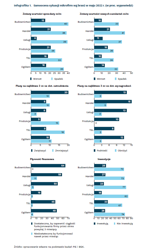 W maju, w porównaniu do kwietnia, w 35 proc. mikrofirm nastąpił spadek sprzedaży, a tylko w 16 proc. jej wzrost. Największe niekorzystne zmiany w wartości sprzedaży dotyczyły mikrofirm funkcjonujących w budownictwie (40 proc. odnotowało spadek) i w usługach (39 proc.). Są to branże, które silnie dotknęły skutki rosnących cen energii, wojny w Ukrainie, przerwanych łańcuchów dostaw towarów oraz rosnącej inflacji. Niepokojący jest również utrzymujący się wysoki (32 proc.) udział mikrofirm wykazujących spadek nowych zamówień m/m i niewielki udział przedsiębiorstw notujących ich wzrost (14 proc.). W maju, w porównaniu do kwietnia, aż 41 proc. mikrofirm w sektorze handlu i 37 proc. w usługach odnotowało spadek nowych zamówień.