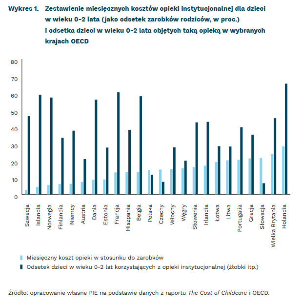 Po drugiej stronie spektrum znajdują się: Szwecja (2,62 proc.), Islandia (4,36 proc.) i Norwegia (5,51 proc.). W Polsce opieka nad najmłodszymi stanowi 14,4 proc. zarobków rodziców, co plasuje nas na pozycjach zbliżonych do Czech (14,69 proc.) i Węgier (15,39 proc.) i jest korzystniejszą sytuacją niż na Litwie (20,14 proc.), w Łotwie (19,18 proc.) czy Słowacji (aż 21,46 proc.).