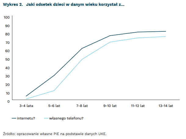 Granicą, która wyznacza powszechne korzystanie z internetu i urządzeń mobilnych jest 11-12. rok życia. Powyżej tego wieku ok. 80-90 proc. dzieci korzysta z internetu, nieco mniejszy odsetek ma własny telefon. W europejskich badaniach EU Kids Online prowadzonych jeszcze przed pandemią, grupa 12-14-latków korzystała dziennie średnio o 69 proc. dłużej z internetu niż 9-11-latkowie (192 minuty dziennie w porównaniu do 114 minut)7. Ale większość zaczyna swoją aktywność online znacznie wcześniej. Jak podaje UKE, 5 proc. badanych dzieci zaczęło korzystać z internetu w wieku 3-4 lata, a 27,6 proc. w wieku 5-6 lat. Warto też zwrócić uwagę, że wiek inicjacji internetowej się obniża: dzieci będące w II klasie szkoły ponadpodstawowej zaczęły korzystać z internetu w wieku ok. 8 lat, a te nieco młodsze, będące w VII klasie szkoły podstawowej przeciętnie w wieku 6 lat i 8 miesięcy8.