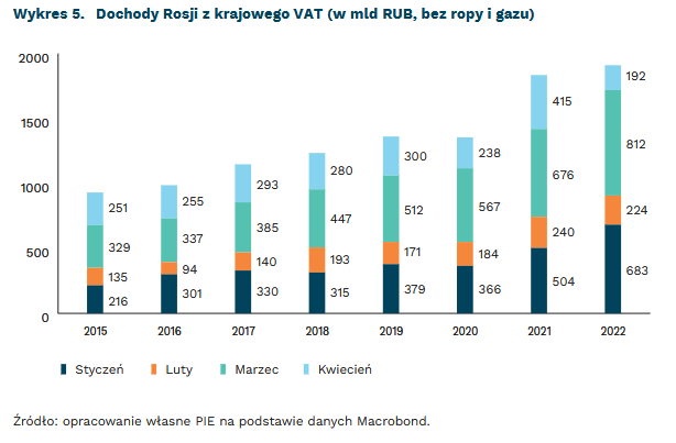 Rosja wpada w kryzys gospodarzy. W kwietniu dochody z podatku VAT tego państwa spadły do 192 mld RUB – to o 54 proc. mniej niż w 2021 r. Oznacza to silny spadek aktywności gospodarczej oraz recesję. Załamanie nastąpiło, mimo wysokiej inflacji – w normalnych warunkach wzrost cen zwiększa dochody budżetowe. Część spadku względem poprzednich miesięcy wynika jednak z efektów kalendarzowych – dochody budżetowe w kwietniu są zawsze niższe niż w poprzednich miesiącach.