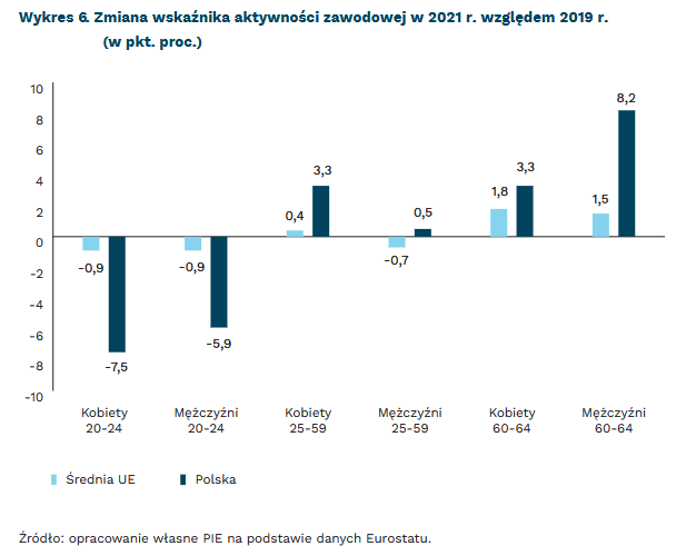 Pandemia zwiększyła poziom aktywności zawodowej wśród osób starszych oraz zmniejszyła wśród osób najmłodszych. Pod tym względem Polska wyróżnia się na tle Europy. Od 2019 r. spadek wskaźnika aktywności zawodowej mężczyzn w wieku 20-24 lata wyniósł -5,1 pkt. proc., a kobiet w tym wieku -7,5 pkt. proc. Chociaż trend dezaktywizacji zawodowej osób młodych w okresie pandemii był widoczny w większości państw Unii Europejskiej, to Polska znajdowała się w czołówce pod względem wielkości tego spadku: średnio aktywność zawodowa osób w wieku 20-24 lata spadła zaledwie o 0,9 pkt. proc. Równocześnie jednak w Polsce wyraźnie wzrósł poziom aktywności zawodowej osób w sile wielu oraz osób w wieku emerytalnym i przedemerytalnym: kobiet w wieku 25-59 lat o 3,3 pkt. proc., mężczyzn w wieku 60-64 lata o 8,2 pkt. proc. oraz kobiet w wieku 60-64 lata o 3,3 pkt. proc.