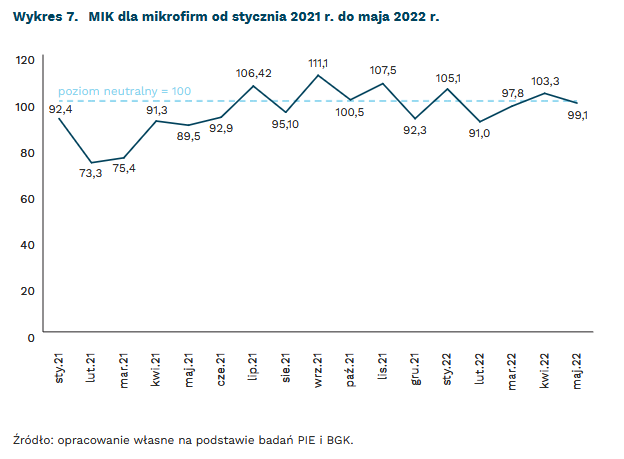 Mikrofirmy wykazują dużą wrażliwość na zmiany w otoczeniu. Pokazuje to Miesięczny Indeks Koniunktury (MIK)40 dla mikrofirm, którego wartość dość istotnie zmienia się z miesiąca na miesiąc. W bieżącym i poprzednim roku w większości miesięcy przeważały nastroje negatywne nad pozytywnymi. W maju wskaźnik spadł do poziomu 99,1 pkt. (wykres 7). MIK dla mikrofirm w trzech ostatnich miesiącach jest najniższy w porównaniu z firmami małymi, średnimi i dużymi. Oznacza to, że spośród wszystkich grup wielkościowych, nastroje mikrofirm są najgorsze.