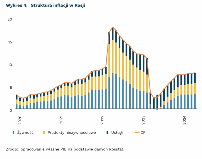 Inflacja w Rosji znacząco przekracza cel inflacyjny. Od prawie roku tempo wzrostu cen w Rosji jest wyższe od celu inflacyjnego, który wynosi 4 proc. Jest to wynik niedoborów pracowników. W wyniku masowej emigracji i poborów do wojska w Rosji mocno rośnie spirala płacowa – przedsiębiorcy utrzymują wysoko wykwalifikowane kadry za wszelką cenę. Powoduje to duży wzrost wynagrodzeń – w ostatnich 12 miesiącach średnie wynagrodzenie wzrosło o 17,1 proc., co oznacza wysoki wynik także w ujęciu realnym.