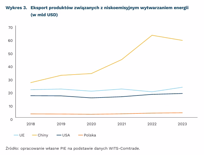 Z kolei udział produktów używanych do niskoemisyjnego wytwarzania energii w dostawach z Polski wyniósł w 2022 r. 1,6 proc. światowego eksportu, czyli 3,3 mld USD. W 2023 r. wywóz z Polski takich urządzeń wzrósł o 7,6 proc. do 3,6 mld USD, co było również wolniejszym tempem wzrostu niż w UE, ale szybszym niż w Chinach czy USA. Trzema najważniejszymi produktami w eksporcie urządzeń do niskoemisyjnej generacji z UE były części do turbin gazowych, panele fotowoltaiczne oraz wymienniki ciepła. W przypadku Polski najważniejszym produktem eksportowym była wełna izolacyjna, akumulatory kwasowo-ołowiowe i turbiny gazowe o mocy nieprzekraczającej 5 tys. kw.