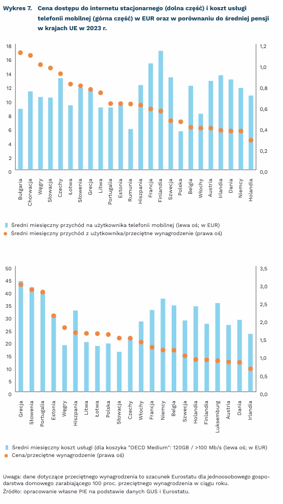 Według raportu UKE, Polska jest jednym z krajów o najniższych cenach usług telekomunikacyjnych w Europie. W przypadku dostępu do internetu stacjonarnego taniej jest tylko na Węgrzech, Łotwie i Słowacji. Natomiast w przypadku usług mobilnych koszty w Polsce są najniższe[2]. Gdy jednak spojrzy się na tę statystykę i porówna do przeciętnych zarobków, widać że usługi telekomunikacyjne w Polsce nie są aż tak tanie. Cena dostępu do internetu stacjonarnego (koszyk średni) to 1,6 proc. średniego wynagrodzenia, a koszt telefonii komórkowej to 0,5 proc. W najtańszej Irlandii jest to odpowiednio 0,6 proc. i 0,4 proc. W takim ujęciu Polska przesuwa się do środka stawki – zajmujemy 14. miejsce pod względem ceny dostępu stacjonarnego i 8. pod względem kosztów telefonii mobilnej. Należy przy tym podkreślić, że o ile w przypadku dostępu do internetu kraje „droższe” niż Polska są krajami porównywalnie lub mniej zamożnymi (z wyjątkiem Hiszpanii i Słowenii), o tyle w przypadku telefonii mobilnej Polska wyprzedza Szwecję, Finlandię czy Francję.