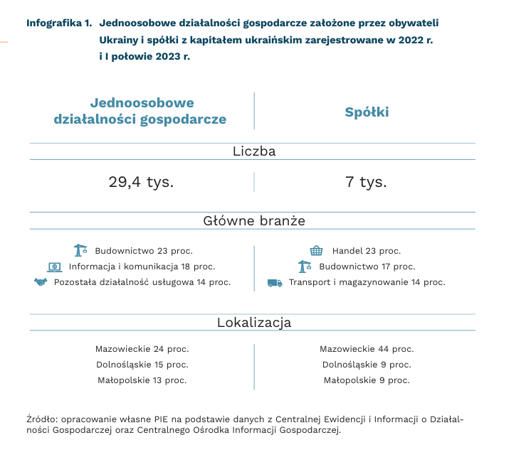 Obecnie w Polsce aktywnych jest prawie 26 tys. spółek z kapitałem ukraińskim i stanowią one nieco ponad 1/4 spółek z kapitałem zagranicznym rejestrowanych w Polsce. Natomiast JDG zarejestrowane od stycznia 2022 r. stanowią 61 proc. wszystkich zagranicznych działalności założonych w tym okresie. W związku z trwającą wojną Polska stała się dla ukraińskich przedsiębiorców naturalną lokalizacją dla działalności gospodarczej. Do wybierania naszego kraju jako lokalizacji zachęcają bliskość kulturowa i geograficzna.