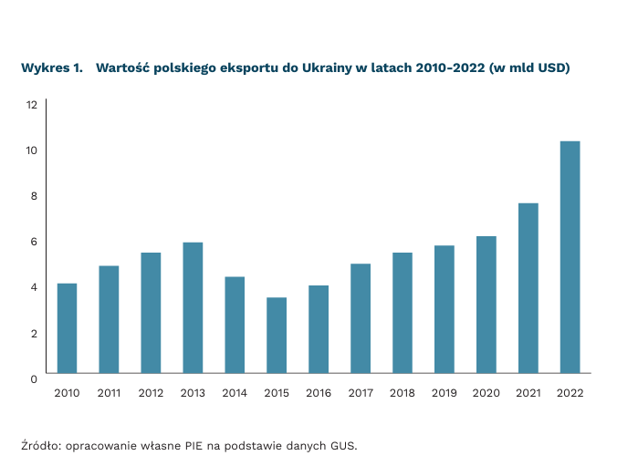 Jak wskazują dane GUS, Polski eksport na Ukrainę przekroczył w 2022 r. wartość 10 mld USD, co oznacza wzrost o 37 proc. w ujęciu r/r. Ukraina z udziałem 2,8 proc. stała się 9. rynkiem eksportowym (w maju 2023 r. nawet już 8.), awansując z 15. miejsca w 2021 r. Polska stała się dla Ukrainy 2. największym dostawcą (udział 10-proc.), zaraz po Chinach, awansując z miejsca 4. i wyprzedzając Niemcy oraz Rosję. Wartość polskiego eksportu na Ukrainę w okresie styczeń-maj 2023 r. utrzymała dynamikę wzrostu. Wynosząc 4,6 mld USD, był wyższy w porównaniu z analogicznym okresem 2021 i 2022 r. o odpowiednio 67 i 52 proc.
