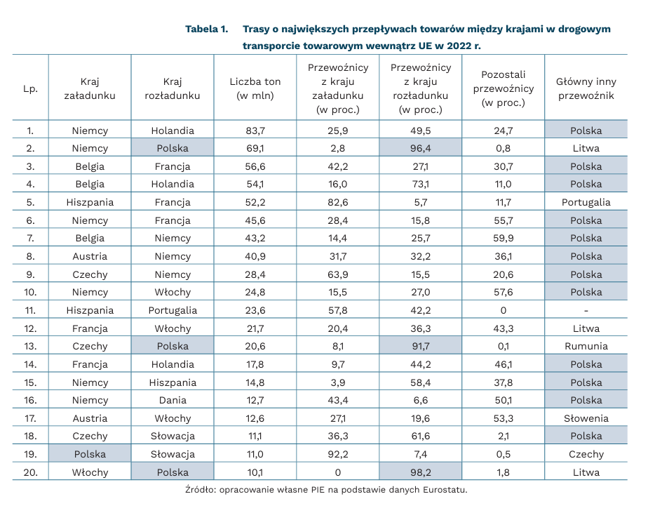 Polskie firmy należą do grona czołowych przewoźników na większości najważniejszych tras w UE. Trasa między Polską i Niemcami jest drugą najważniejszą w UE. W 2022 r. przetransportowano nią 69,1 mln t towarów, z czego 96,4 proc. przewiozły podmioty z Polski. Podobne odsetki występują w przypadku tras Czechy-Polska, Włochy-Polska oraz Polska–Słowacja. Polskie firmy przewiozły tam kolejno 92 proc., 98 proc. i 92 proc. towarów.