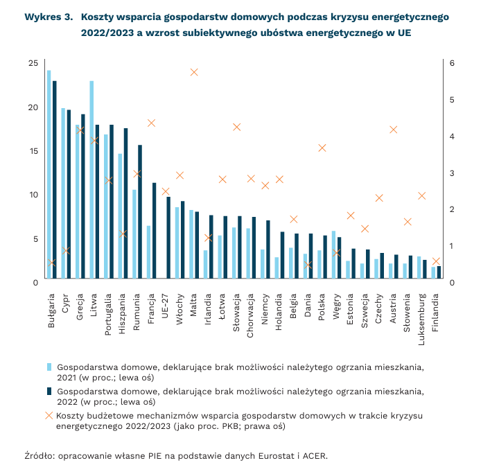 Według ACER państwa UE wydały w 2022 r. ponad 360 mld EUR na wsparcie gospodarstw domowych w walce z kryzysem energetycznym, uruchamiając 280 programów. Najczęstszymi formami wsparcia były bezpośrednie transfery dla gospodarstw (bony, zasiłki, subsydia) i obniżka podatków na energię dla odbiorców końcowych. Koszt programów pomocowych w latach 2022-2023, średnio na poziomie 2,4 proc. PKB, wahał się od 0,37 proc. PKB (Dania) czy 0,43 proc. PKB (Bułgaria) do 5,6 proc. (Malta) i 4,3 proc. (Francja). Koszt polskich programów wsparcia w latach 2022-2023 został oszacowany na około 3,6 proc. PKB, czyli ok. 1550 USD/mieszkańca rocznie i był o 19 proc. (1,2 pkt. proc. PKB) wyższy od średniej unijnej.
