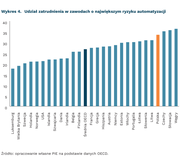 Według najnowszej edycji raportu Employment Outlook aż 27 proc. obecnych miejsc pracy w państwach OECD jest zagrożonych automatyzacją. Ryzyko to jest wyższe w państwach z wysokim odsetkiem zatrudnienia w sektorze produkcyjnym oraz w zawodach polegających na wykonywaniu rutynowych czynności. Według szacunków ryzykiem automatyzacji w Polsce objęte jest prawie 34 proc. miejsc pracy. Odzwierciedlenie tych statystyk jest widoczne w obawach pracowników o utratę pracy. Aż 63 proc. pracowników w sektorze finansowym i 57 proc. w produkcyjnym w krajach OECD obawia się utraty swojego stanowiska ze względu na sztuczną inteligencję w ciągu następnych 10 lat.