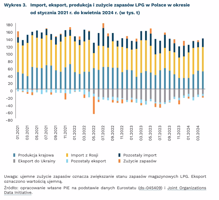 W 2023 r. udział dostaw z Rosji w całkowitym imporcie wyniósł 68 proc. wolumenu oraz 65 proc. wartości, co stanowiło istotny spadek w porównaniu z 2022 r., kiedy rosyjskie dostawy stanowiły 72 proc. wolumenu i 69 proc. wartości. W 2023 r. wartość LPG importowanego z Rosji wynosiła 333 mln EUR. Od 2022 r. Polska reeksportuje LPG do Ukrainy. W 2023 r. wartość tego eksportu wyniosła 206 mln EUR, a więc aż 62 proc. wartości importu rosyjskiego LPG.