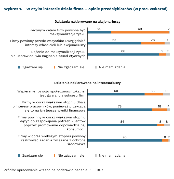 Blisko dwie na trzy firmy stoją na stanowisku, że przedsiębiorstwa powinny przede wszystkim uwzględniać interesy właścicieli lub akcjonariuszy, którzy zwykle oczekują wzrostu wartości firmy i maksymalizacji zysku. Dążenie do maksymalizacji nie usprawiedliwia jednak naginania zasad etycznych – z tym stwierdzeniem zgadza się 86 proc. przedsiębiorstw. Aż 69 proc. badanych firm nie zgadza się ze stwierdzeniem, że jedynym celem przedsiębiorstwa powinna być maksymalizacja zysku, natomiast blisko 30 proc. jest przeciwnego zdania.