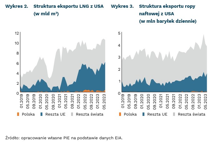 Do Polski w okresie styczeń-maj 2023 r. trafiło 1,52 mld m3 LNG z USA, według EIA (Energy Information Administration). Tylko w maju 2023 r. Polska była czwartym największym unijnym importerem LNG ze Stanów (0,49 mld m3). Do Polski trafiło ponad 3 proc. amerykańskiego eksportu LNG. Jest on kluczowym elementem dywersyfikacji dostaw gazu do Polski – według ENTSOG dostawy LNG z USA do terminala LNG stanowiły w 2023 r. średnio ok. 40 proc. importu gazu miesięcznie. Polska dywersyfikuje również dostawy ropy naftowej. Choć USA eksportuje do Polski niecały 1 proc. swojego wolumenu, to z czasem możliwości przepustowe Polski pozwolą na zwiększenie dostaw. W pierwszej połowie 2023 r. polski Naftoport przeładował prawie 18 mln t ropy naftowej. Do końca br. może przeładować 36 mln t, czyli o 50 proc. więcej względem rekordowych 24,5 mln t w 2022 r. Do 2029 r. przepustowość Naftoportu może wzrosnąć do 45 mln t ropy rocznie, czyli ok. 0,9 mln baryłek ropy naftowej dziennie.