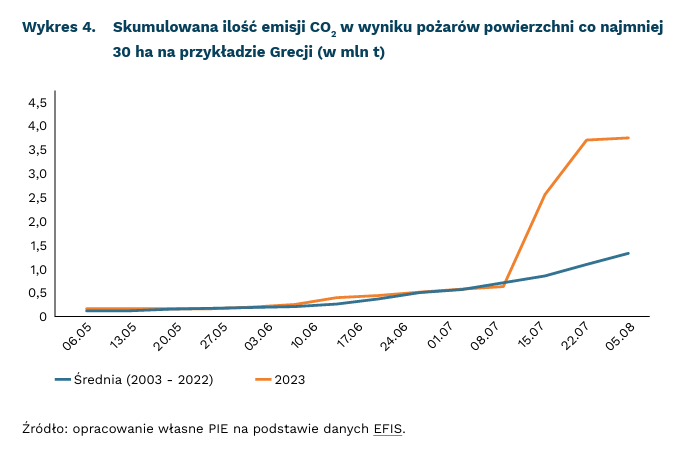 Pożary nie omijają UE: do 5 sierpnia spaleniu uległo 252 tys. ha. To o prawie 65 tys. ha więcej niż wynosi średnia z lat 2003-2022. Najwięcej pożarów ma miejsce na południu kontynentu. Pożary te zostały poprzedzone intensywną falą upałów oraz długotrwałym deficytem opadów. Szczególnie dotkliwy był pożar w Grecji w drugiej połowie lipca. Skutkował on m.in. największą ewakuacją ludności w historii kraju oraz dużą emisją pyłów i gazów cieplarnianych. Szacuje się, że pożary te wyemitowały około 3,5 mln ton CO2 , czyli znacznie powyżej średniej dla tej pory roku. Wielkość ta odpowiada około 6,5 proc. rocznej greckiej emisji CO2 ze spalania paliw kopalnych i przemysłu.