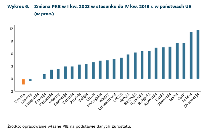 Czechy najsłabiej w UE radziły sobie od czasu pandemii COVID-19 pod względem wzrostu gospodarczego. W I kw. 2023 r. gospodarka była mniejsza o 1,2 proc. Zdecydowanie niższe też były wydatki konsumpcyjne gospodarstw domowych – łącznie zmalały o 4,2 proc. Znacząco spadły wydatki gospodarstw domowych – wyniki są słabsze o 9,2 proc. niż przed pandemią. Jedynie po części rekompensował to wzrost wydatków publicznych. Spowolnienie miało niewielkie skutki dla rynku pracy – stopa bezrobocia w badaniach ankietowych wynosi 2,7 proc. – analogicznie jak w Polsce.