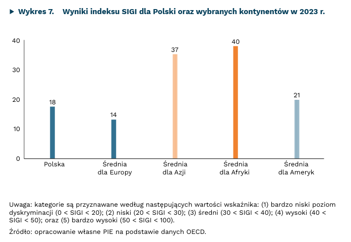 Polska uzyskała 18 pkt., co w skali świata plasuje ją w grupie krajów o najniższym stopniu dyskryminacji. Odnosząc ten wynik do obszaru Europy, Polska znajduje się dopiero na 30. miejscu (wykres 8). Rozpatrując wyniki dla poszczególnych wymiarów wskaźnika Polska otrzymała najlepsze wyniki w kategorii dyskryminacji w rodzinie oraz ograniczeń swobód obywatelskich. Są to odpowiednio 8 i 11 pkt. Znacznie gorsze wyniki Polska otrzymała w kategorii ograniczeń integralności cielesnej – 32 pkt. i ograniczeń w dostępie do zasobów produkcyjnych oraz finansowych – 21 pkt.