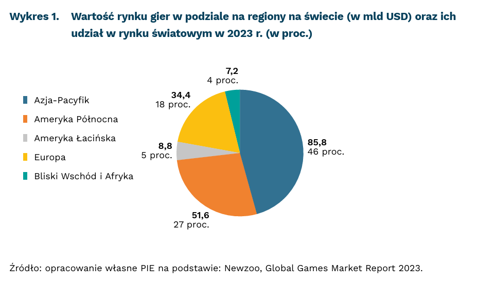 97 proc. produkcji polskiej branży gier jest eksportowana (PARP). Z kolei Raport firmy Newzoo prezentuje branżę gier w globalnej perspektywie. W 2023 r. liczba graczy na świecie ma osiągnąć prawie 3,4 mld, co oznacza wzrost o 6,3 proc. r/r[1]. Z kolei liczba osób płacących za gry ma wzrosnąć o 7,3 proc. r/r i osiągnąć w 2023 r. 1,47 mld. Największym rynkiem graczy jest region Azji i Pacyfiku (1,8 mld graczy), następnie Bliski Wschód oraz Afryka (574 mln), Europa (447 mln), Ameryka Południowa (335 mln) oraz Ameryka Północna (237 mln). W poszczególnych segmentach branży gier generujących największe przychody prym wiodą gry mobilne (prognozowane 92,6 mld USD w 2023 r., +0,8 proc. r/r), gry konsolowe (56,1 mld USD, +7,4 proc. r/r), gry komputerowe (37,1 mld USD, +1,6 proc. r/r oraz gry na przeglądarkach komputerowych, w ramach usług chmurowych (1,9 mld USD, -16,9 proc. r/r).