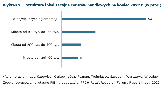 Nasycenie powierzchnią centrów handlowych dla całej Polski na koniec 2022 r. osiągnęło poziom 341 m2 na 1000 mieszkańców, przy czym dla miast z centrami handlowymi było istotnie wyższe – 674 m2. Z raportu PRCH Retail Research Forum (PRCH) wynika, że udział największych aglomeracji, według lokalizacji centrów handlowych, zmniejszył się z 69 proc. w 2005 r. do 54 proc. w 2022 r. Natomiast udział miast poniżej 100 tys. mieszkańców wzrósł z 7 proc. do 11 proc.