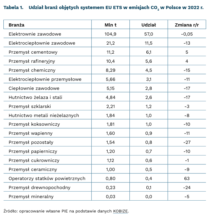 Jak podaje Krajowy Ośrodek Bilansowania i Zarządzania Emisjami (KOBIZE), emisje z sektorów objętych systemem EU ETS w Polsce w 2022 r. wyniosły 185 mln t CO2 . Jest to spadek o 4 proc. w stosunku do roku poprzedniego i o 7 proc. w porównaniu do 2021 r. Za największą część emisji odpowiadają elektrownie (57 proc. i 104,9 mln t) i elektrociepłownie zawodowe (11,5 proc. i 21,2 mln t). Spośród gałęzi przemysłu objętych EU ETS najwięcej emituje przemysł cementowy, tj. 6 proc. i 11,2 mln t, rafineryjny 5,6 proc. i 10,4 mln t oraz chemiczny 4,5 proc. i 8,3 mln t. Wysoko jest również przemysł hutnictwa żelaza i stali z udziałem 2,6 proc. i wolumenem emisji na poziomie 4,8 mln t. Razem z branżą chemiczną są to najbardziej energochłonne branże ujęte w EU ETS. Poza tym systemem wyżej niż chemiczna jest branża spożywcza i tytoniowa.