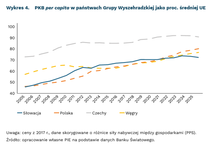 Słowacka gospodarka spowolniła. Łączny wzrost PKB od IV kwartale 2019 r. wyniósł 3 proc. To zdecydowanie mniej niż w Polsce, państwach bałtyckich czy na Węgrzech. Dlatego począwszy od 2020 r. średni poziom dochodów przypadających na mieszkańca spadł z 74 proc. do 72,5 proc. średniej unijnej. Szanse na szybkie odwrócenie trendu są małe. Prognozy analityków ankietowanych przez Focus Economics wskazują, że wzrost gospodarczy Słowacji będzie wolniejszy niż Polski – o ile w tym roku ma oscylować wokół 1,1 proc., to w kolejnych latach PKB zwiększy się o 2,0-2,6 proc. W przypadku Węgier czy Polski konsensus prognoz zakłada zdolność do wzrostu w granicach 3,0-3,5 proc. do 2026 r.