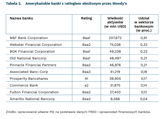 Rewizja ratingów dotyczy banków regionalnych. Wspomniane 10 banków posiada łącznie aktywa odpowiadające 2,5 proc. wartości środków zgromadzonych w sektorze finansowym. Każdy z banków ma dalej rating inwestycyjny. Agencja Moody’s zwraca uwagę, że problemy widoczne w I kwartale wciąż nie zostały wyeliminowane. Głównym zagrożeniem jest ryzyko bankructwa mniejszych podmiotów oraz problemy z wypłacalnością sektora nieruchomości komercyjnych (CRE). Deweloperzy działający w tej branży mogą mieć trudności ze spłatą zadłużenia z uwagi na wysokie stopy procentowe i strukturalne zmiany na rynku nieruchomości, np. więcej pracy zdalnej ogranicza popyt na biurowce. Dlatego spadają ceny takich nieruchomości – analitycy firmy konsultingowej Greenfield wskazują, że obniżka sięga 12 proc. r/r., mimo wysokiej inflacji. Dla banków oprócz większego ryzyka oznacza to także spadek wartości zabezpieczenia.