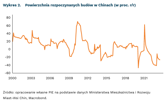 Nasilają się też problemy sektora nieruchomości. Przed pandemią COVID-19 Chiny systematycznie stymulowały wzrost poprzez inwestycje na rynku nieruchomości – celem była urbanizacja terenów wiejskich, jednak trend ten spowolnił. Przed zastojem rynek nieruchomości odpowiadał nawet za 33 proc. wzrostu gospodarczego. Piętrzące się problemy demograficzne oraz słabnący popyt wewnętrzny sprawiają, że sprzedaż mieszkań była najniższa od ponad 10 lat. Perspektywy pozostają słabe. Liczba nowych budów maleje – w czerwcu ich powierzchnia była o 24,5 proc. mniejsza niż przed rokiem. Od pandemii mocno spadły też ceny nieruchomości.
