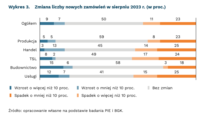 Na spadek liczby nowych zamówień najbardziej narzekała branża TSL (41 proc.), usługi (40 proc.) i handel (39 proc.). Szczególnie niekorzystny trend widać w branży TSL, w której tylko 10 proc. firm odczuło wzrost liczby nowych zamówień, co zapewne wiąże się z osłabionym popytem. Lepsza sytuacja panuje w usługach i handlu. W tych branżach udział przedsiębiorstw ze wzrostem liczby nowych zamówień był większy (odpowiednio: 19 proc. i 16 proc.). Warto podkreślić, że w usługach aż 12 proc. firm odnotowało wzrost liczby nowych zamówień o więcej niż 10 proc. Można tu zauważyć wpływ okresu wakacyjnego, ale trudno mówić o dużym ożywieniu rynku przez konsumpcję indywidualną.
