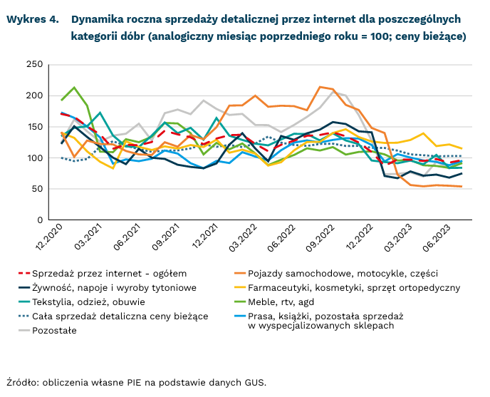 Wartość sprzedaży detalicznej realizowanej przez internet, wg danych raportowanych przez GUS, zmalała w ciągu roku o 4,4 proc. Obecnie 7,9 proc. całej sprzedaży detalicznej jest realizowana w tym kanale. Jest to wprawdzie wzrost w porównaniu do czerwca (7,7 proc. przy wzroście sprzedaży o 4 proc. m/m), ale jednocześnie druga najniższa wartość od dwóch lat i ósma najniższa wartość od początku 2020 r. Należy przy tym zaznaczyć, że GUS nie zbiera danych ze wszystkich firm – w badaniu biorą udział tylko firmy zatrudniające więcej niż 10 pracowników, nie są brane pod uwagę zagraniczne platformy sprzedażowe (np. AliExpress czy Amazon.de). Dodatkowo wszystkie dane podawane są w cenach bieżących.