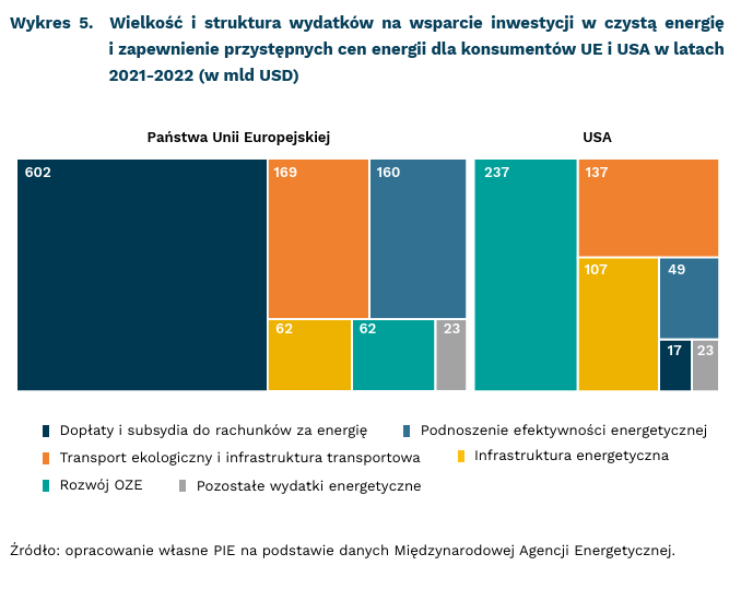 Stany Zjednoczone, choć wydają niemal dwukrotnie mniej na energetykę, o 13 proc. więcej inwestowały w rozwój technologii i infrastruktury. W latach 2021-2022 USA wydały 237 mld USD (42 proc. wydatków) na rozwój OZE oraz 137 mld USD na infrastrukturę transportową (24 proc.) i 107 mld USD na infrastrukturę energetyczną (19 proc.), przede wszystkim sieci przesyłowe i dystrybucyjne oraz sekwestrację CO2 (CCS). Mniejszą rolę niż w UE odgrywało w USA podnoszenie efektywności energetycznej (9 proc. wydatków). USA, w odróżnieniu od UE-27, nie były dotknięte kryzysem energetycznym spowodowanym rosyjską inwazją na Ukrainę w 2022 r., dlatego na wsparcie cenowe gospodarstw domowych i przemysłu wydały 36 razy mniej niż państwa UE-27 – tylko 17 mld USD.