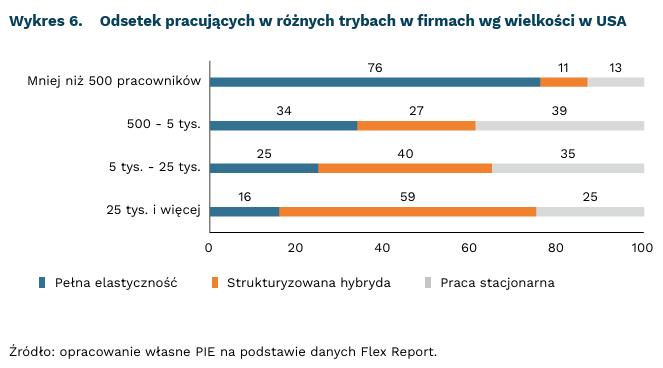W mniejszych firmach pełna elastyczność pracy jest znacznie bardziej popularna niż w firmach największych (+25 tys. pracowników). W USA w firmach zatrudniających mniej niż 500 pracowników pracujący zdalnie (lub mogący tak pracować) stanowią aż 76 proc. Z kolei w największych pełna elastyczność to tylko 16 proc., ale hybrydowa forma świadczenia pracy to już 59 proc. Jedynie w firmach zatrudniających między 500 a 5 tys. pracowników najpopularniejszą formą pracy jest praca z biura (39 proc.).