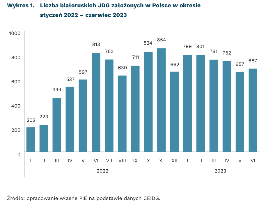 Od stycznia 2022 r. do końca czerwca 2023 r. obywatele Białorusi założyli w Polsce 11 716 jednoosobowych działalności gospodarczych (JDG). W samym 2022 r. w Polsce do ubezpieczeń emerytalnego i rentowych zgłoszono 108 tys. Białorusinów (ponad dwukrotnie więcej niż w 2020 r.). Represyjna polityka w Białorusi i często związane z tym trudności w prowadzeniu działalności gospodarczej, a także perspektywa zamknięcia granicy polsko-białoruskiej spowodowały wzrost zainteresowania Białorusinów poszukiwaniem możliwości pracy za granicą oraz współpracy z firmami polskimi.