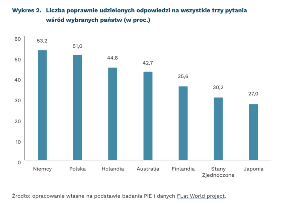 Wynik ten jest stosunkowo dobry w skali międzynarodowej. Plasuje on Polskę w ścisłej czołówce obok Niemiec (53 proc. poprawnych odpowiedzi na trzy pytania). Trzeba jednak zauważyć, że dane dla pozostałych państw są dość stare (lata 2009-2014), dlatego należy patrzeć na nie z pewnym z dystansem. W tym czasie wyniki dla poszczególnych państw mogły ulec zmianie między innymi za sprawą coraz powszechniejszej edukacji ekonomicznej czy kryzysów ekonomicznych.
