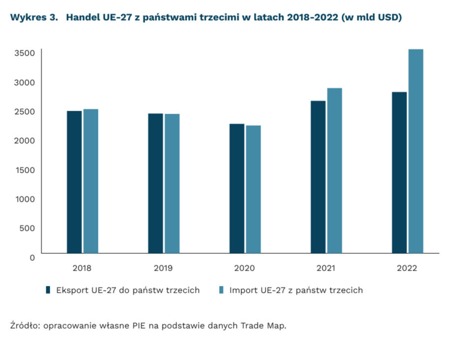Współczesne przekształcenia międzynarodowego systemu handlowego stanowią dla UE bodziec, by skuteczniej negocjować umowy z partnerami spoza Europy oraz przeprowadzić ratyfikację porozumień już wynegocjowanych. Eksport UE do państw trzecich w 2022 r. wyniósł 2,8 bln USD (udział 40 proc.), a import 3,5 bln USD (udział 48 proc.). W przypadku Polski było to 83,3 mld USD w eksporcie oraz 173,2 mld USD w imporcie, przy udziałach wynoszących odpowiednio 24 proc. i 48 proc.