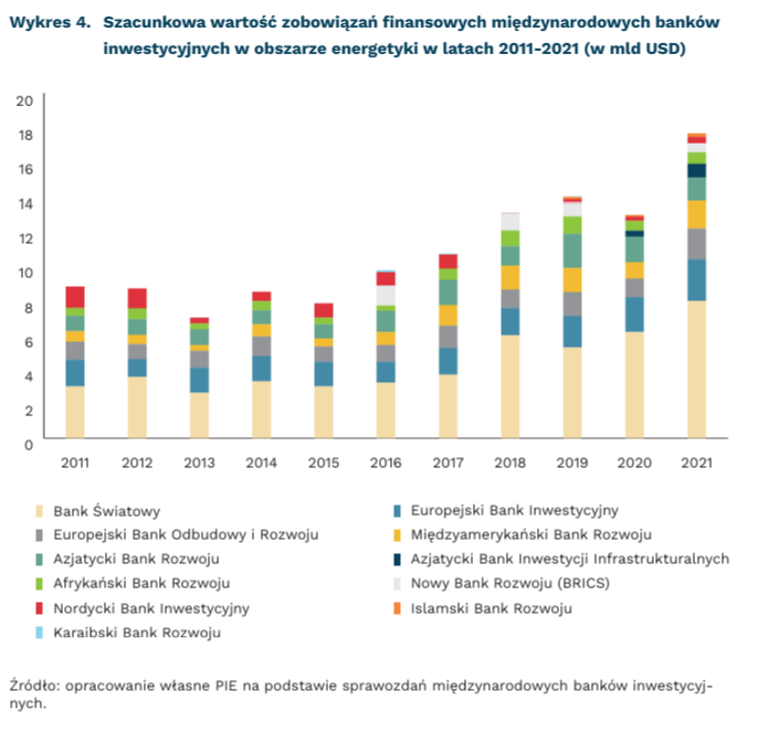 Międzynarodowe banki inwestycyjne przeznaczyły 118 mld USD na energetykę w latach 2011-2021[1]. Najwięcej zainwestował Bank Światowy (47,8 mld USD) i Europejski Bank Inwestycyjny (17,5 mld USD). Utworzony w 2015 r. przez organizację BRICS (Brazylia- Rosja-Indie-Chiny-Południowa Afryka) Nowy Bank Rozwoju, który miał stać się alternatywą dla wiodących międzynarodowych banków inwestycyjnych, zainwestował w tym okresie w inwestycje w obszarze energetyki 3,5 mld USD, tj. 13-krotnie mniej niż Bank Światowy i 5-krotnie mniej niż Europejski Bank Inwestycyjny.