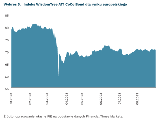 Rynek obligacji AT1 miał problemy w marcu. Odbicie od tego czasu jest umiarkowane. Bloomberg wskazuje, że średnia stopa zwrotu z funduszy ETF posiadających takie obligacje za okres od marca do końca lipca wynosiła 13 proc. Mimo to w ostatnich miesiącach rynek nie odrobił strat z apogeum kryzysu Credit Suisse. Cytowany indeks WisdomTree AT1 CoCo Bond, który śledzi ceny europejskich obligacji „coco”, obejmuje w portfelu obligacje szwajcarskich i europejskich banków, m.in.: UBS Group (2,26 proc. aktywów), Societe Generale S.A. (2,78 proc) czy HSBC Holdings (1,33 proc.). Jego wycena na koniec sierpnia jest o 10 proc. niższa w styczniu 2023 r.