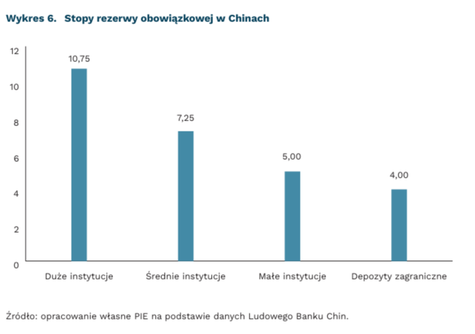 Faktycznym impulsem będzie obniżenie stawki rezerwy obowiązkowej dla dużych banków. Wykorzystanie tego instrumentu sprzyja odbiciu akcji kredytowej, często też pomaga obniżyć końcowe oprocentowanie depozytów bez zmian stopy procentowej. Administracja Chin wykonała taki ruch w marcu – wielkość stawek została obniżona o 0,25 pkt. proc. dla większości podmiotów. Analitycy ankietowani przez Reuters wskazują, że taki ruch uwolnił aktywa o wartości ok. 72 mld USD. Prawdopodobne są dalsze cięcia po wakacjach, chociaż takie ruchy zazwyczaj zaskakują rynki. Wysokość stóp rezerwy obowiązkowej jest dużo wyższa niż w gospodarkach rozwiniętych, np. w strefie euro wynosi ona 1 proc., w USA efektywnie nie obowiązuje (0 proc.).