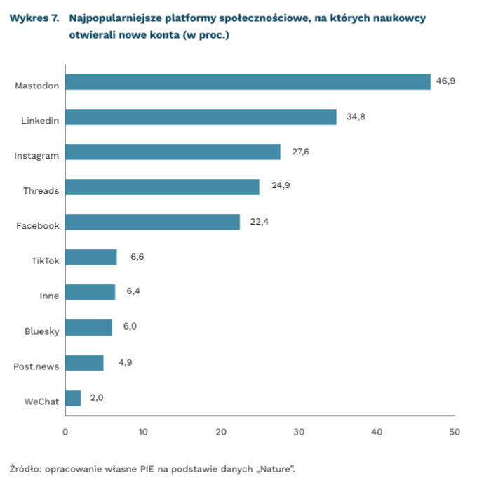 Tysiące naukowców opuszcza platformę społecznościową X, po objęciu kontroli przez Elona Muska w październiku 2022 r. Tak wynika z przeprowadzonej przez „Nature” ankiety wśród 9200 naukowców. Blisko połowa ankietowanych osób (47,7 proc.) twierdzi, że w ostatnich sześciu miesiącach rzadziej korzystało z X, a 6,7 proc. w ogóle przestało korzystać z platformy. Co więcej, zmiany na platformie zmotywowały ponad połowę respondentów (53,9 proc.) do otworzenia konta na nowej platformie społecznościowej. Najpopularniejszymi wyborami wśród naukowców okazały się: Mastodon (46,9 proc.), LinkedIn (34,8 proc.) i Instagram (27,6 proc.).