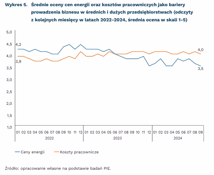 Ceny energii oraz koszty pracownicze to główne bariery utrudniające prowadzenie biznesu – wynika z badań przeprowadzonych w PIE w ramach Miesięcznego Indeksu Koniunktury (MIK). Wprawdzie od początku 2022 r. do połowy 2023 r. ceny energii bardziej doskwierały przedsiębiorcom niż koszty pracownicze, to jednak w bieżącym roku uciążliwość ta wyraźnie zmniejszyła się. Średnia ocena uciążliwości (w skali 5-stopniowej) nie przekraczała poziomu 4, a w ostatnim wrześniowym odczycie wyniosła 3,5. W opinii przedsiębiorców od połowy 2023 r. do chwili obecnej koszty pracownicze silniej niż ceny energii utrudniają prowadzenie działalności.