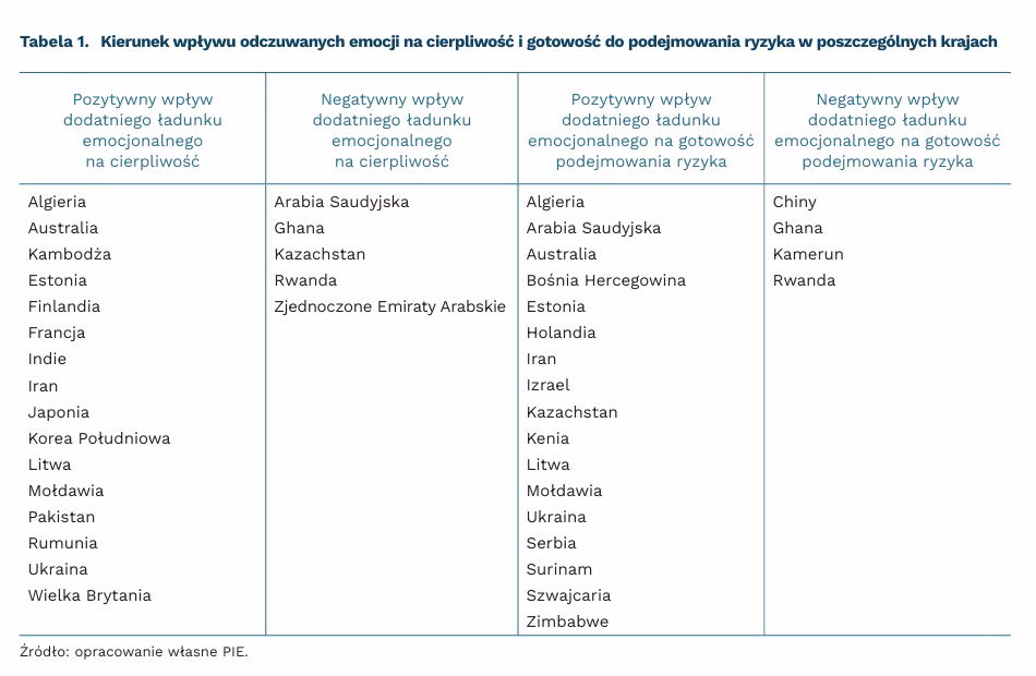 Na uwagę zasługuje też fakt, że dodatni ładunek emocjonalny był silnym predyktorem cierpliwości tylko w 16 krajach, a w 17 wiązał się z mniejszą awersją do ryzyka. Odwrotne zależności zaobserwowano odpowiednio w 5 i 4 krajach.