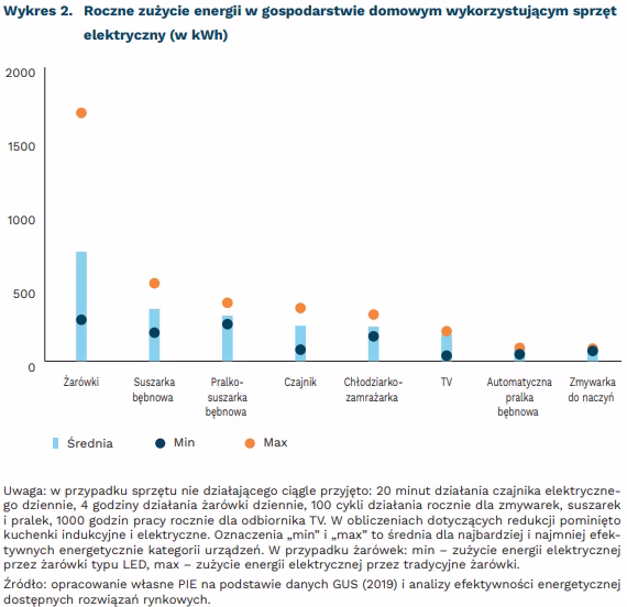 Łącznie modernizacja powszechnego sprzętu RTV i AGD oraz wymiana oświetlenia z żarówek tradycyjnych na LED obniżyłaby zużycie energii przez gospodarstwa domowe o 9,2 TWh (31 proc.). W przypadku zamiany na żarówki LED także innych rodzajów oświetlenia, jak świetlówki kompaktowe i żarówki halogenowe, łączna redukcja wzrosłaby do 12,7 TWh (43 proc).